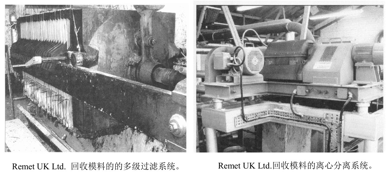 目前,無論外,大多數精鑄廠家采用蒸汽脫蠟法。脫出的模料中常含有質量分數 5%~15%的水分, 15%~35%的填料(對填料蠟),和大約 0.5% 的陶瓷類夾雜物 [2] 。回收處理的關鍵是將這些陶瓷類夾雜物除去,因為它們是模料中殘留灰分的主要來源。當然其他一些無機化合物,諸如氧化鐵之類,也是必須嚴格控制的。傳統的模料回收方法是沉降法。這種方法處理過程耗時長,而且沉降物不密實,收得率也不高。更好的方法是采用高效的加壓多級過濾或/和離心分離法,以加速處理過程并獲得更純凈的模料。圖 1-1 和圖 1-2 所示分別為英國Remet UK Ltd.的過濾和離心分離系統 [2] 。不難看出,當前國外流行的模料回收處理方法,其技術關鍵就在這種多級過濾凈化系統。經過過濾的模料通常具有良好的物理性能,灰分含量可降 0.05%甚 0.03%以下,可與無填料的新蠟媲美,直接用作民用精鑄件模樣蠟或澆道蠟。如再補充一些原材料和附加物(通常是添加某些烴蠟),則可進一步獲得符合標準規格或用戶要求的再生蠟。回收蠟中如再加入一些新蠟、樹脂和填料,也可制成某些精鑄件使用的填料蠟。采用離心分離所得回收模料中灰分含量通常要比過濾處理的高,經常達 0.1%甚更高。